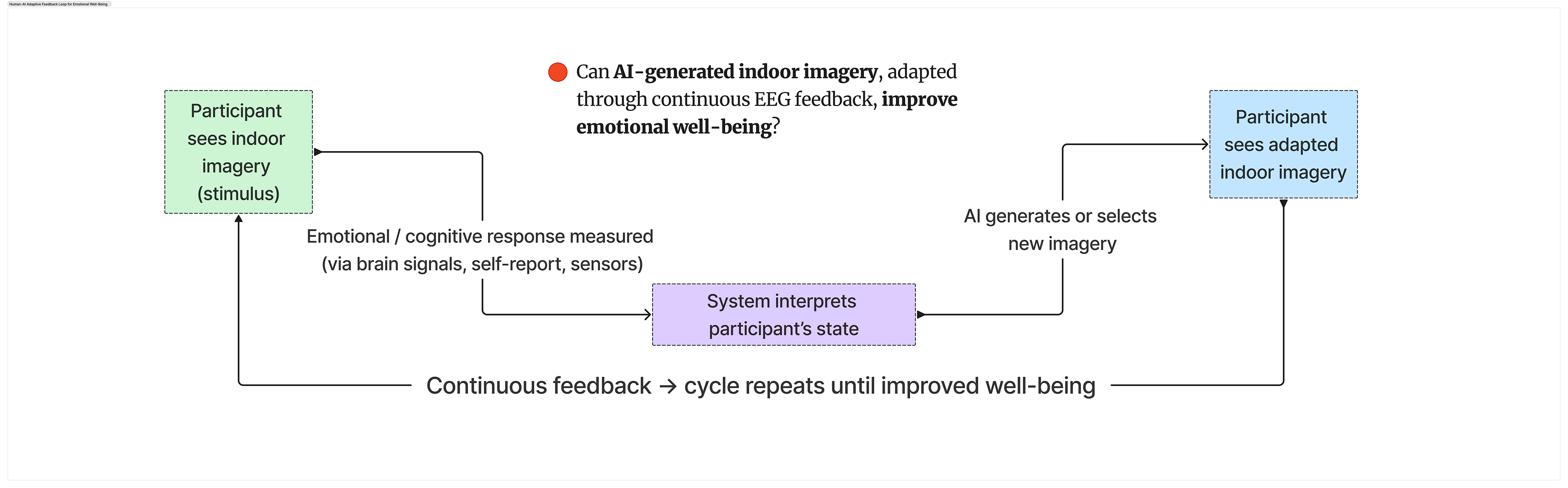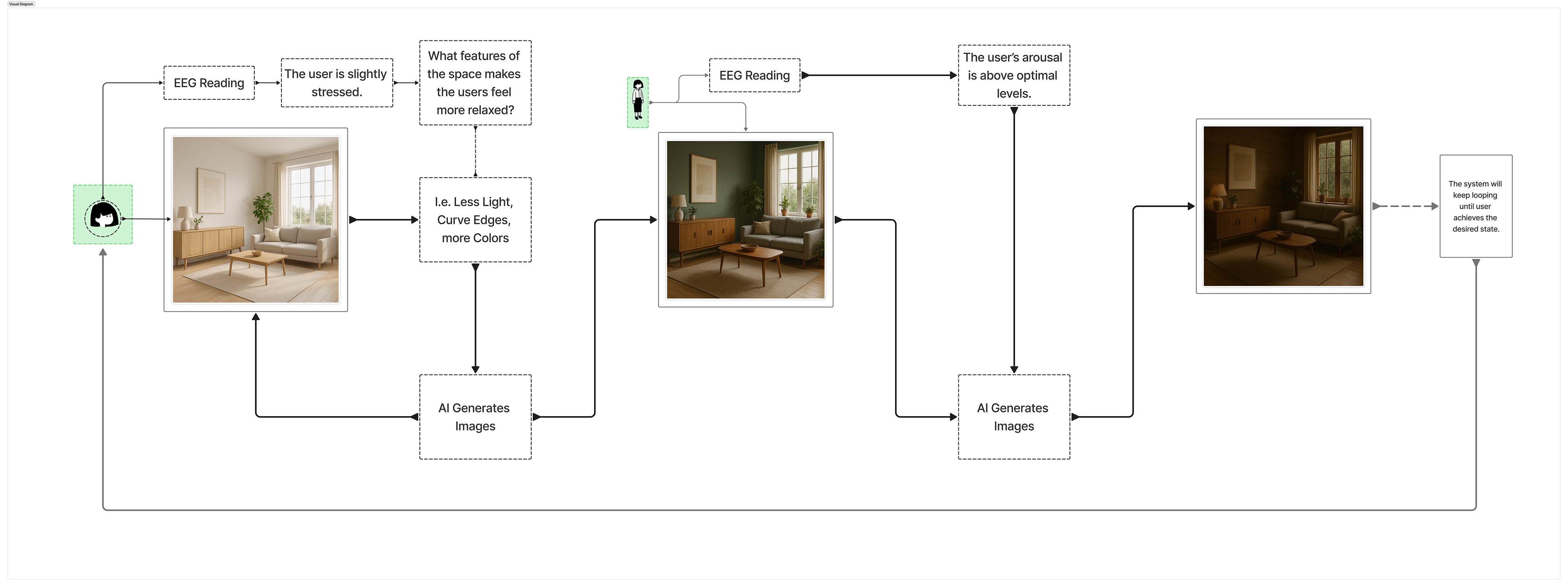 Figure 3. Diagram of the closed-loop adaptive system. EEG readings and self-reports inform the AI about the user’s stress or arousal level, prompting the generation of new images with adjusted visual features such as lighting, color, and form. The process repeats until the user’s emotional state reaches the target balance.
