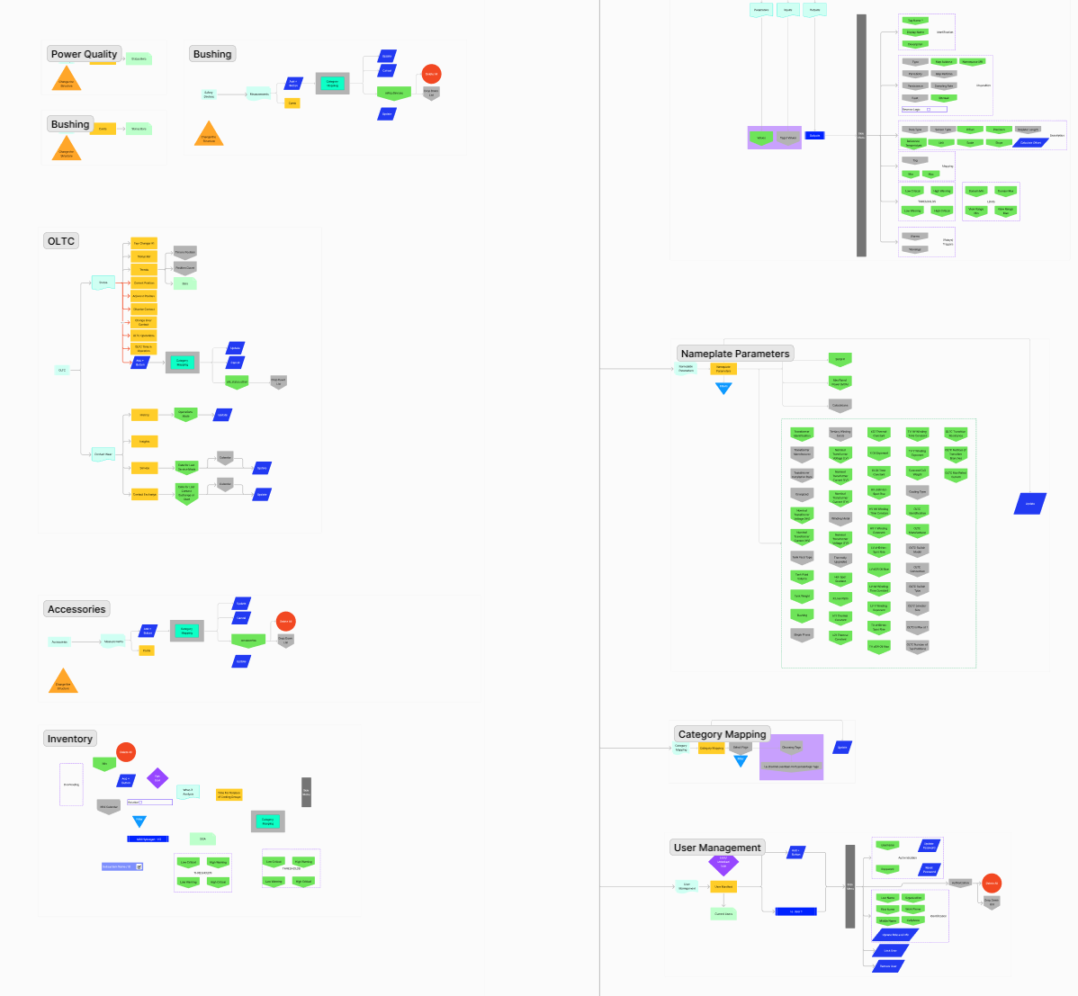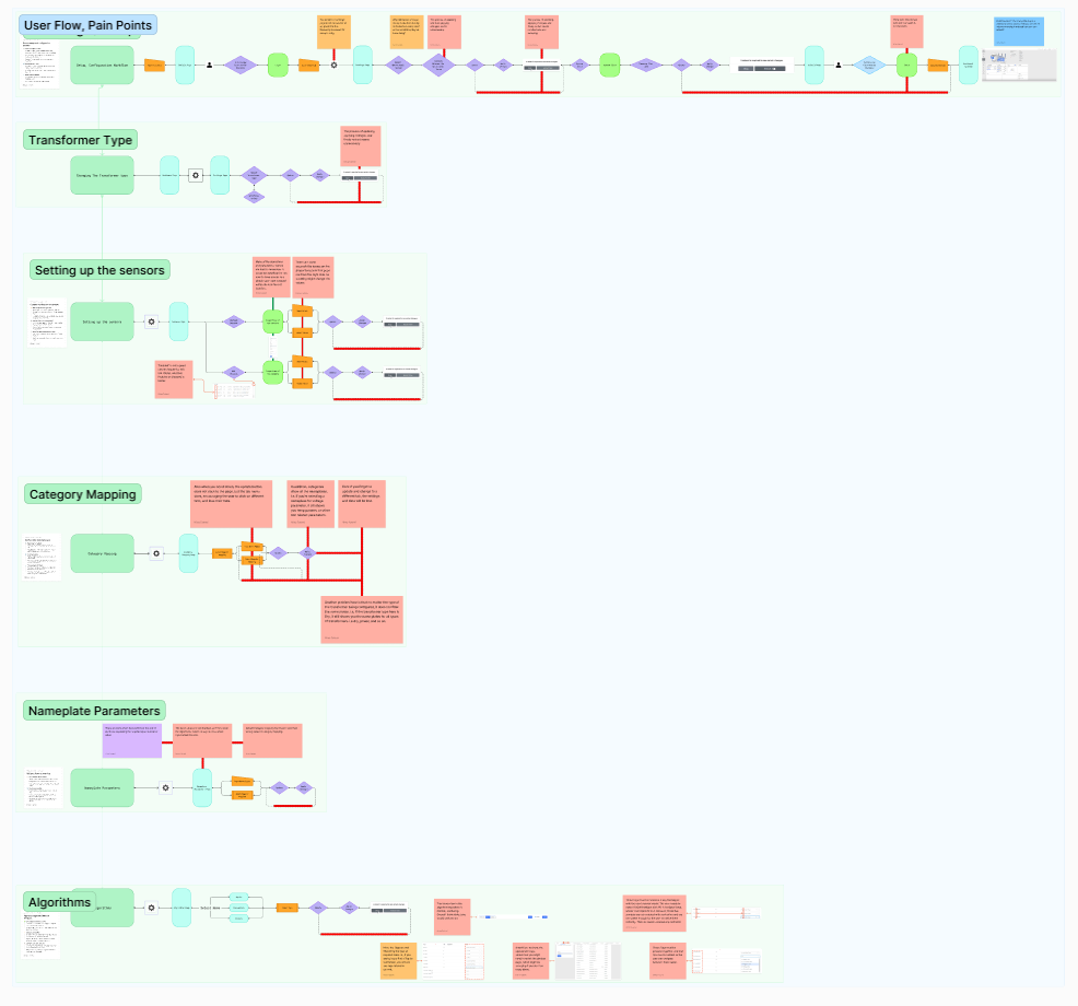 Task Analysis Mapping of Existing Workflows. This map visually dissects the workflows for key software functions (e.g., Power Quality, Accessories, Inventory). Each node represents a required click or step, clearly highlighting the excessive complexity and multiple decision points (pain points are flagged by color) that contribute to a high cognitive load and frequent errors.