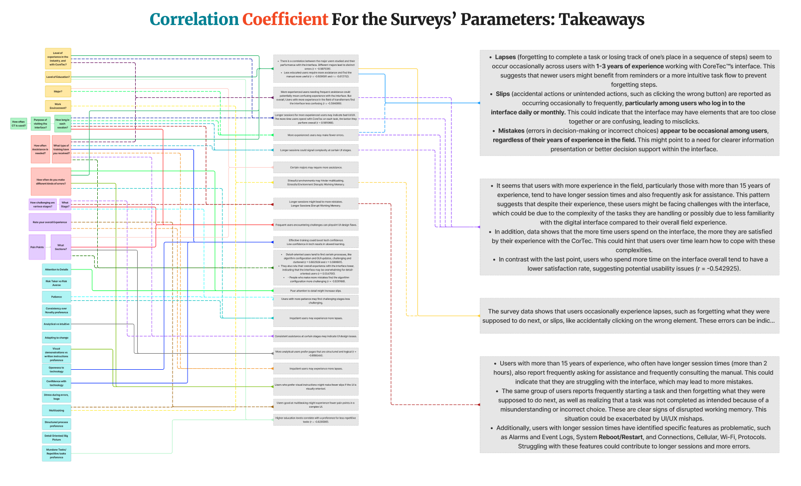 Synthesis of Survey Parameters and Usability Takeaways. This visualization maps the correlation coefficients between users' subjective ratings (e.g., pain points, perceived memory load) and objective data (e.g., years of experience, session time). The analysis directly links specific interface failures to distinct user behaviors and experience levels.