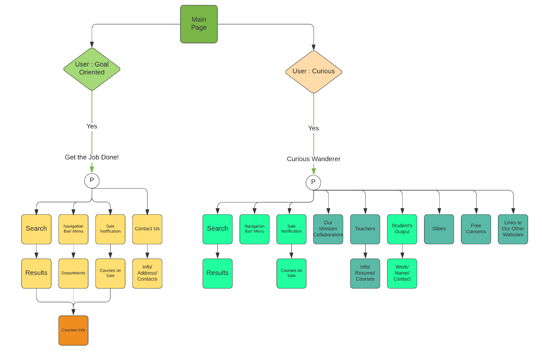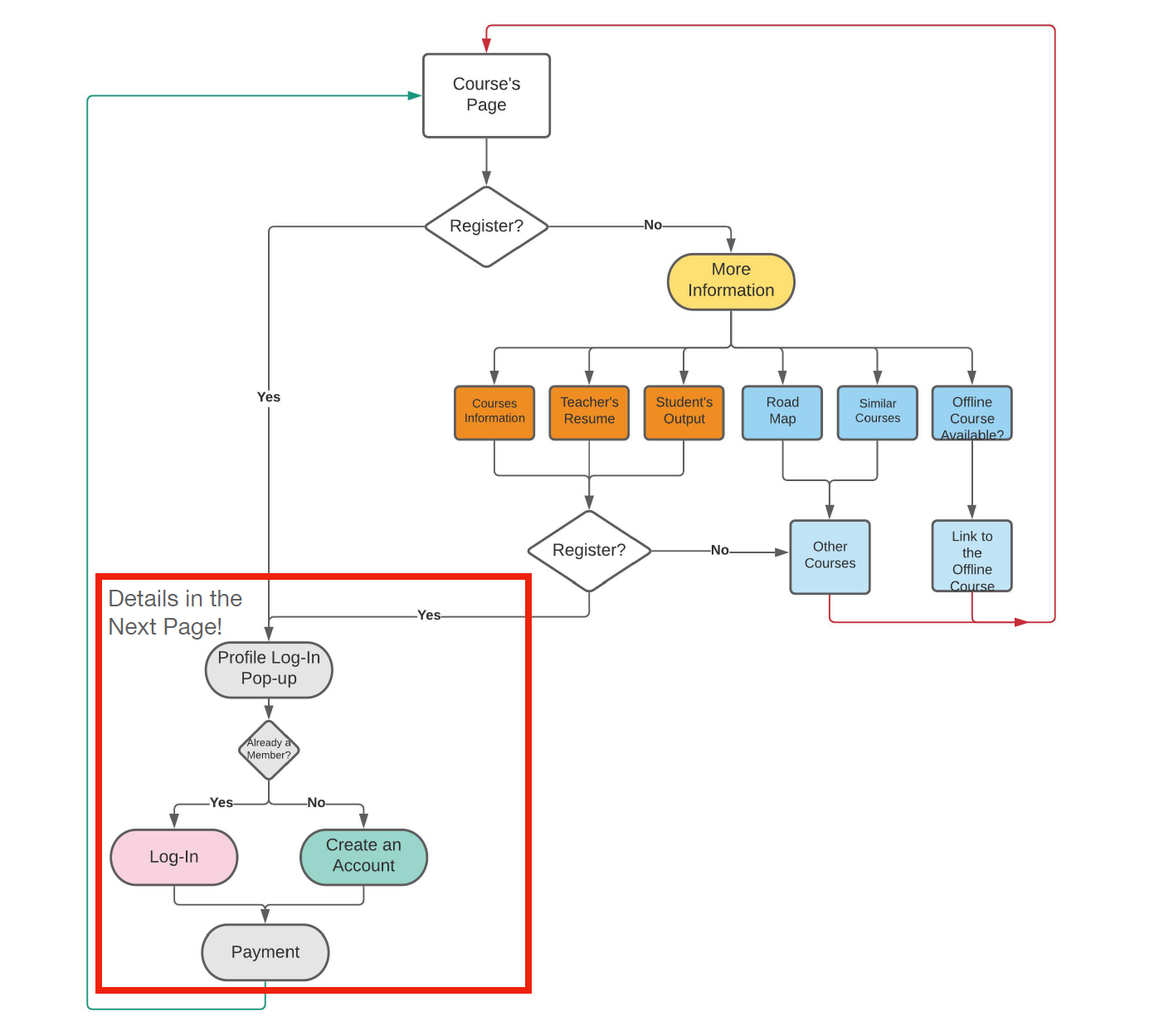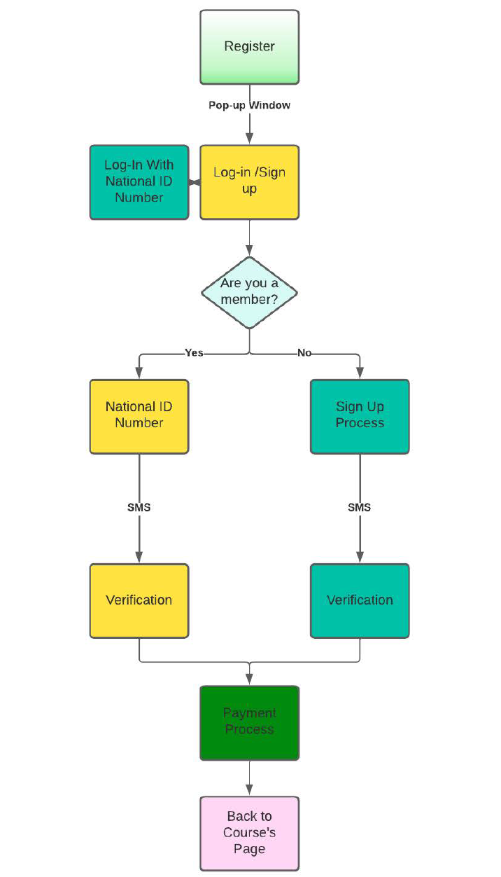 Derived from website analytics and heuristic analysis, these user flow diagrams illustrate key student journeys through the website. We used these diagrams to pinpoint critical drop-off points, understand where students disengaged, and identify opportunities to optimize the flow from course discovery to registration on both mobile and desktop interfaces.