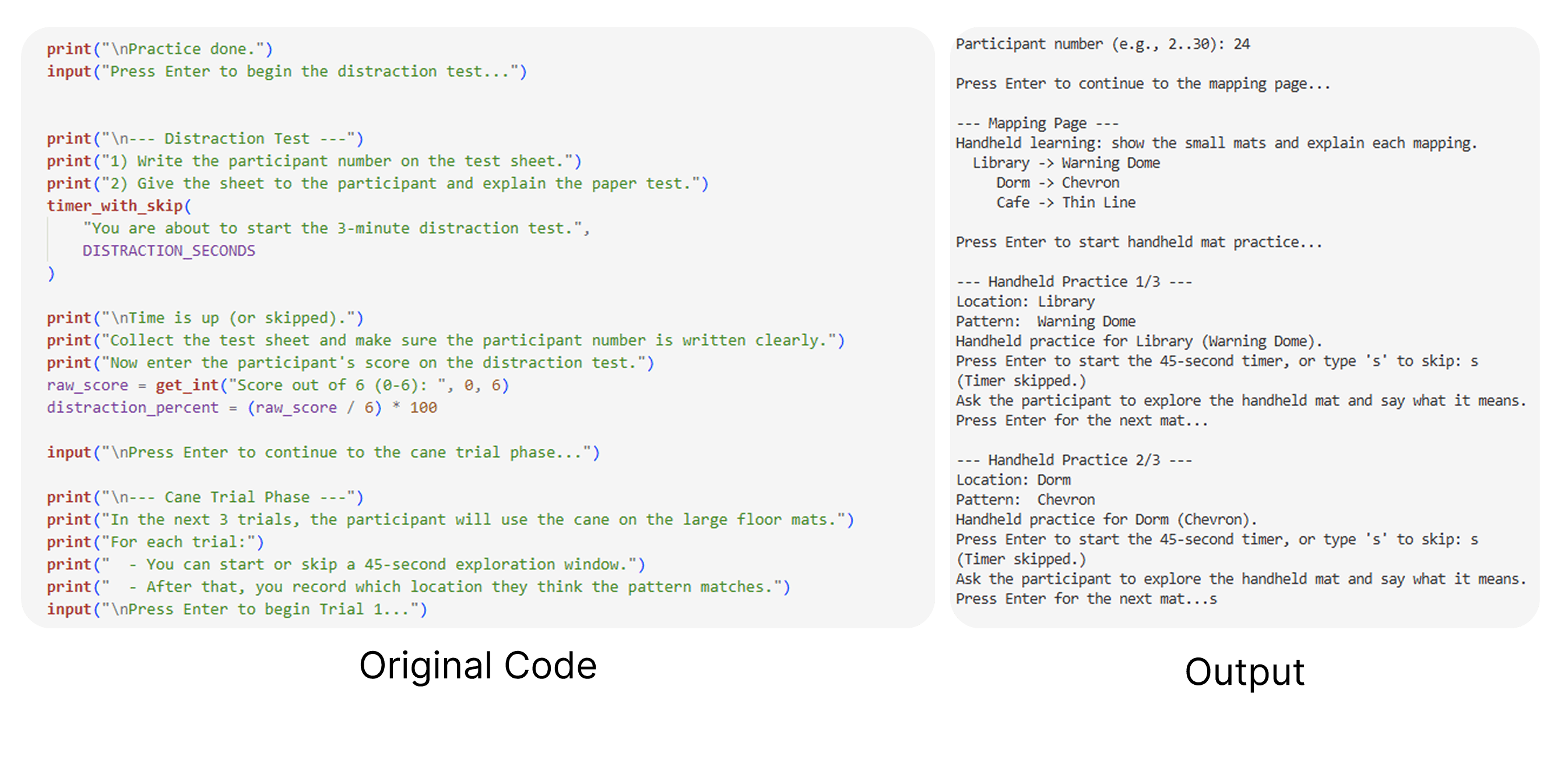 In-person within-subject pilot (N = 15, blindfolded). Participants learned 3 tactile patterns by hand, completed a short recall and distraction step, then identified the same patterns on full-size floor mats using a cane. We built a Python-guided workflow to standardize timing, randomize pattern-to-meaning pairings, and prevent missing data.